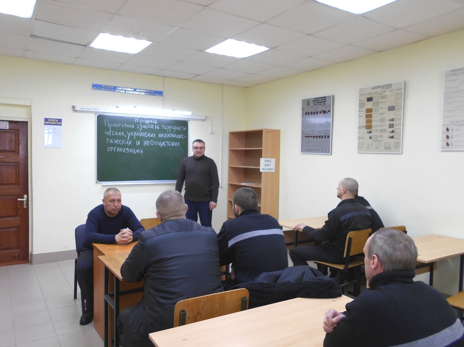 Осужденным рассказали о причинах развития терроризма и экстремизма на различных этапах развития общества, признаках вовлечения в деструктивный и экстремистский контент, преступной сущности террористических, украинских националистических и неонацистских организаций, задачах и целях, которые они преследуют. Здесь же были приведены примеры крупнейших террористических актов, совершенных на территории Российской Федерации и в мире.