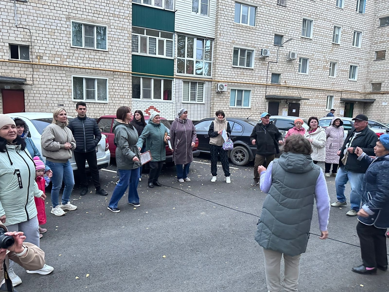 На детской площадке возле дома собрались взрослые и дети, чтобы позитивно провести вечер, поближе познакомится друг с другом и отдохнуть в тёплой соседской обстановке.