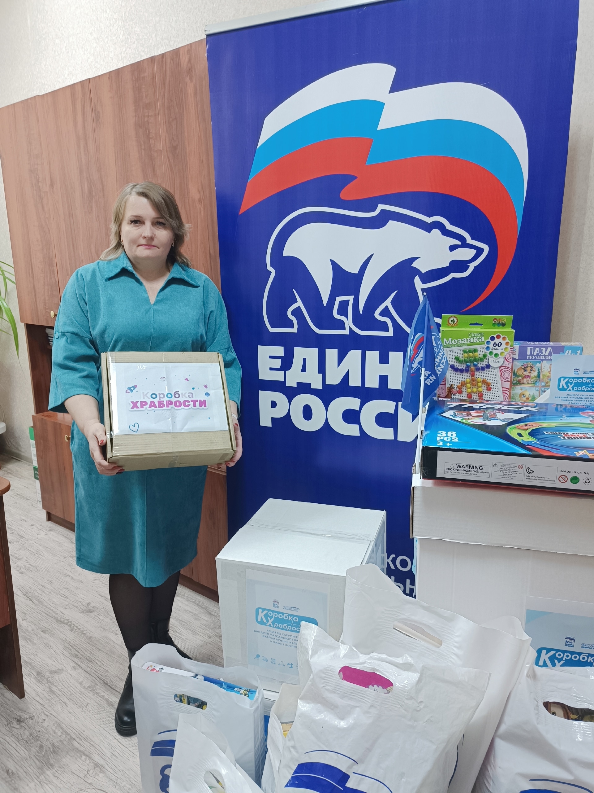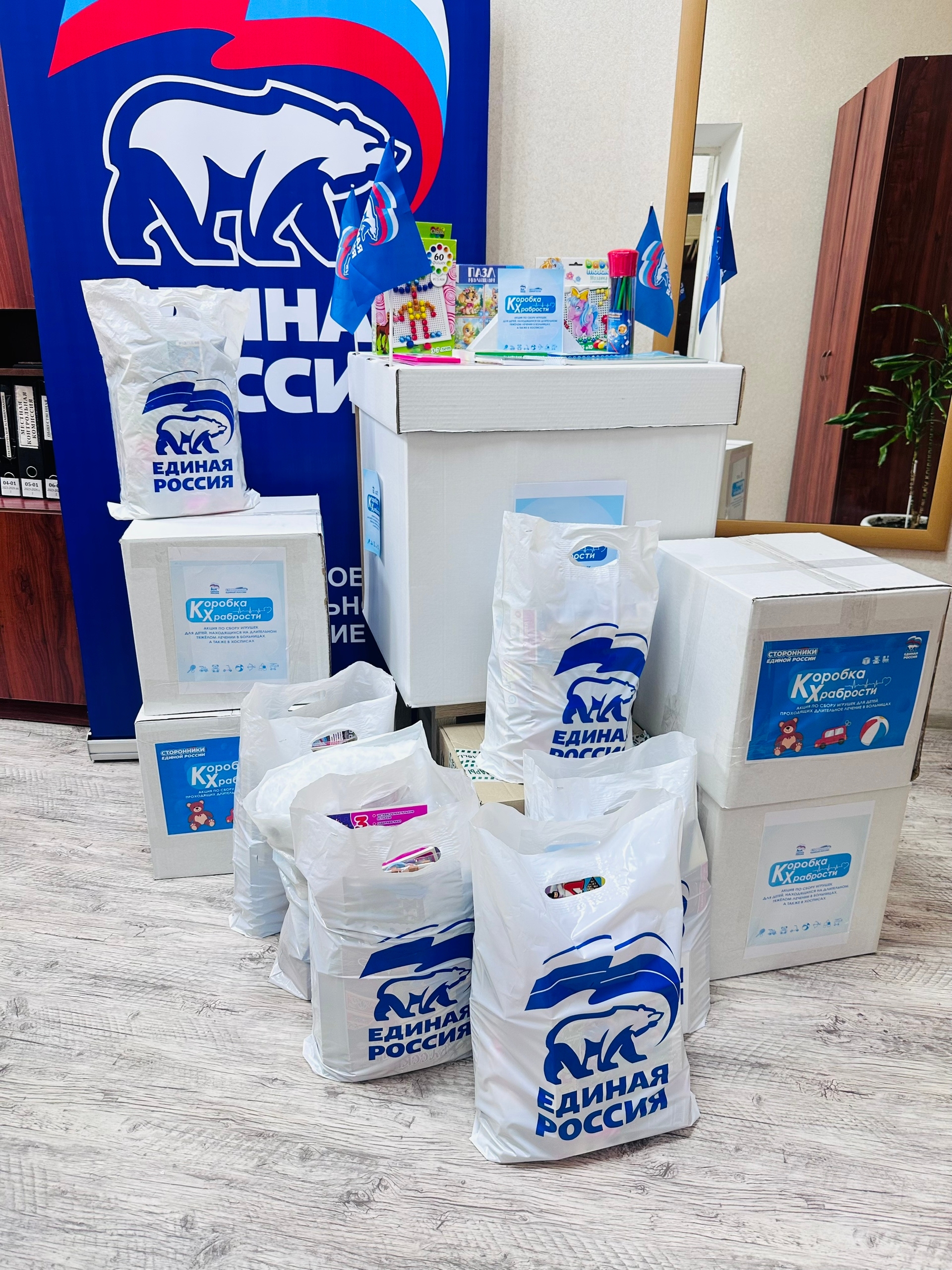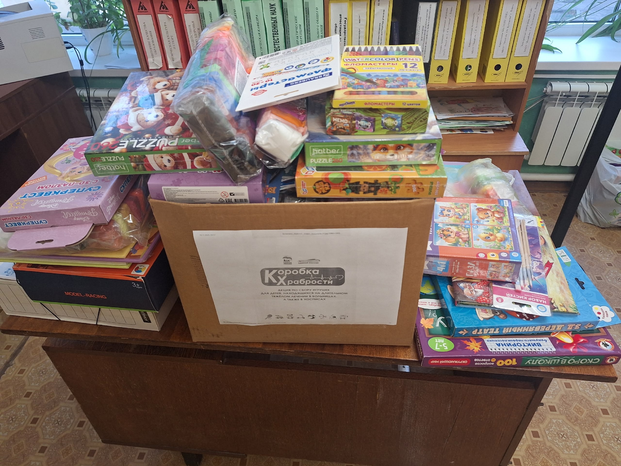 Каждый желающий мог принести новые игрушки, канцтовары, книги, раскраски, наборы для творчества и настольные игры в «Коробку храбрости», из которой после неприятных или болезненных процедур маленькие пациенты могут выбрать себе «награду».