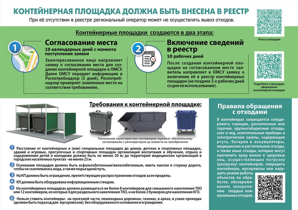 Подробный алгоритм действий для создания новой контейнерной площадки, а также требования к ним можно найти в инфографике, предоставленной региональным оператором.