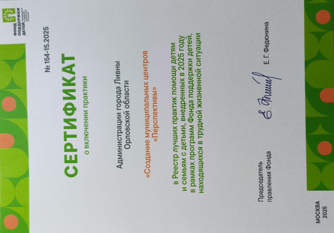 В соответствии с решением Экспертного совета Фонда в 2025 году в Реестр по направлению «Профилактика безнадзорности и правонарушений несовершеннолетних, находящихся в конфликте с законом» включена практика администрации города Ливны по созданию муниципальных центров «Перспективы». Проект нашего города будет размещен на официальном сайте Фонда в разделе «Лучшие практики».