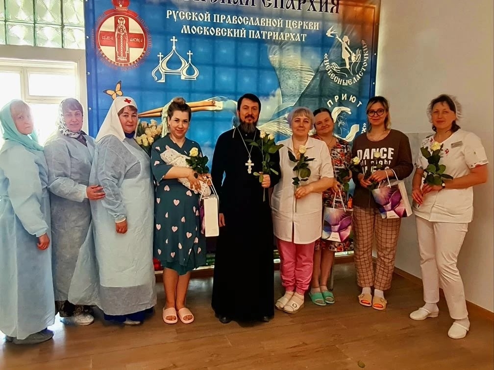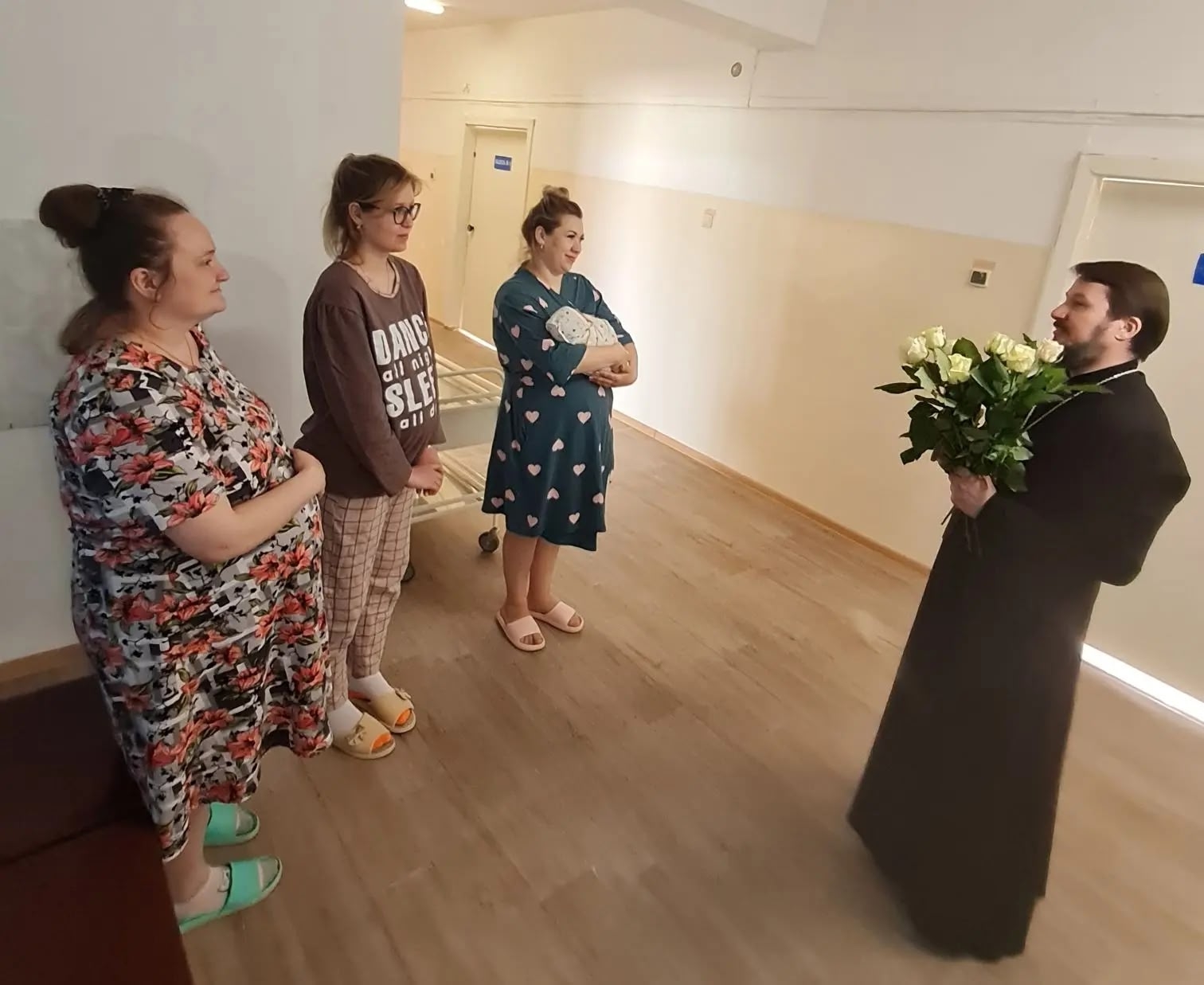В родильном отделения женщин, ожидающих появления малыша, а также тех, кто совсем недавно стали мамами, поздравили сотрудники приюта для мам « Всё в твоих руках» и священнослужители.